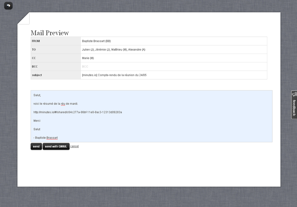 El resultado de las reuniones apuntadas con minutes.io es un documento que puedes enviar directamente por correo a los integrantes.